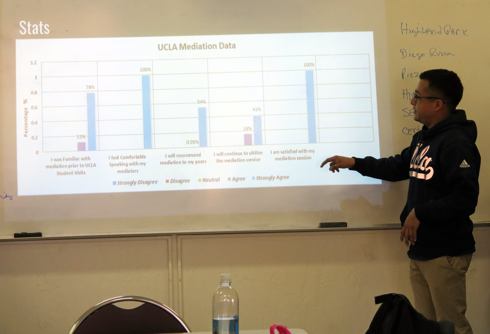 Above: Romel Lopez, a UCLA undergrad in “Restoring Civility,” shares his experience of bringing conflict mediation to Los Angeles schools.