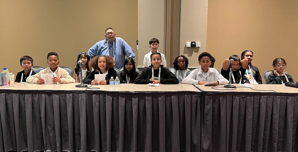 UCLA TEP alumnus Laurence Tan (standing) prepared fifth graders from Oakland Academy of Knowledge to present their research at AERA in April. The students conducted a research project around a Black reparations initiative in Oakland Unified School District and its impacts on their school.